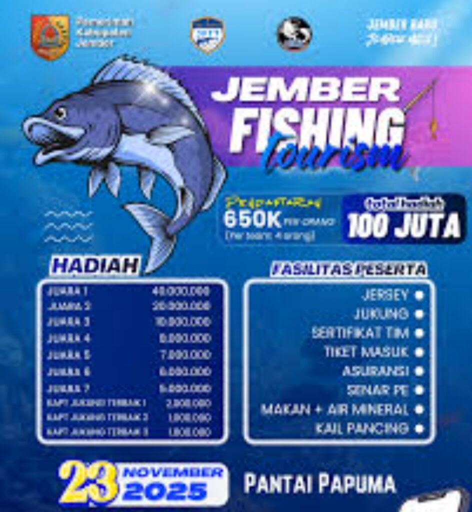 Sebagai informasi, Jember Fishing Tourism 2025 digelar atas kerjasama antara Dinas Pariwisata dan Kebudayaan Kabupaten Jember dengan komunitas pemancing lokal. Panitia mengundang peserta dari dalam kabupaten hingga keluar provinsi Jawa Timur. Total hadiah event itu mencapai 100 Juta Rupiah. (Sgt)